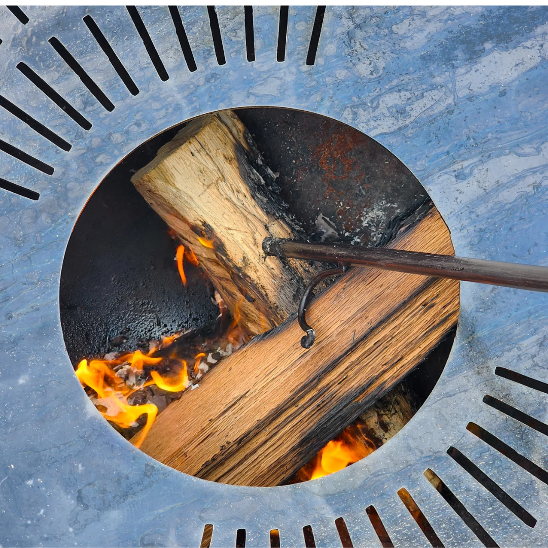 The large center opening allows easy access to the fire, so you can add wood, adjust logs, or stoke the fire without removing the grate. Two smooth solid steel cooking areas provide stable surfaces perfect for skillets, pans, kettles, or other cookware, giving you flexible cooking options while enjoying your fire pit.